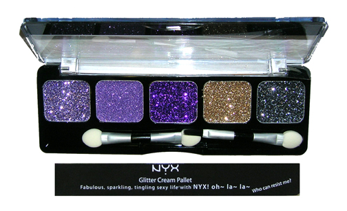 Tomorrow is New Year’s Eve when we’ll finally say goodbye to tiresome 2010 and usher in “bringing back old-school partying 2011”. You did get the memo, right? Yes, this coming year is all about partying like it’s 2069, and while there are endless ways to add glitz and glamour to your evening, one of the easiest is to use NYX Glitter Cream Palletts (sure the correct word is “palette”, but that’s how it’s spelled on the packaging, and really- what do you want for $3.99? ). They come in an exciting range of colors and the cream is really an invisible base that’s jam packed with dazzling gems of glitter. Shown in the photo is 07 Royal Violets, which has three fabulous shades of purple as well as gold and a silvery gunmetal. To see how much pizzaz they delivered, I skipped the applicator and just used my finger to pat some onto my lids. Tomorrow night, I’ll pump up the drama with eyeshadow and contour… KABLAM!