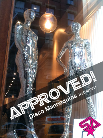 This sparkling photo was submitted for approval by NYC legend Mother Krunk who said that these gorgeous creatures were so dazzling, he didn’t even notice where he saw them! Turns out, they live in the window of a SoHo boutique owned by a reality TV star who will remain nameless. Why, you ask? Because the Sparkle Army is Superstar Heavy, but CELEBRITY FREE! That’s right Soldiers, you don’t have to be a starf*cker to recognize that these “pyramid” mirror-tiled Disco Mannequins are not only fabulous, they are APPROVED!