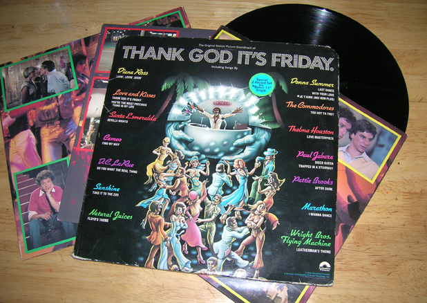 Back to the point anyway.. last weekend I discovered a treasure among treasures in the record bin- the “Thank God It’s Friday” soundtrack! I already have the movie in my DVD collection, but seeing and touching this piece of history was like discovering the holy grail. This album is the perfect example of why vinyl was, and still is, so much better. First, there’s the album art which includes inner sleeve covers for each of the three discs (2 plus 1 bonus disc!), all covered with various disco-tastic images from the movie. Then, as a favor to all the DJ’s out there, the BPM for each track is noted for seamless mixing. This album has so many classics on it such as the self titled theme song by Love and Kisses, Patti Brooks’ legendary “After Dark” and “Last Dance” from our queen, Donna Summer. However, my new obsession is Sunshine‘s “Take It To The Zoo” , which is one sexified, hypnotic track, especially when they sing, “It’s fridaaay night.. thank GAaawwd”.