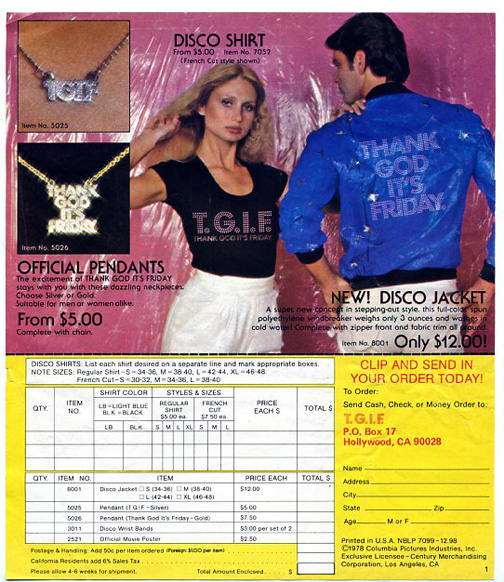 Lastly, the best and most dazzling thing about record albums is the additional stuff they used to put inside them and this one had a fabulous but forgotten gem- an order form for official TGIF merchandise! It’s been laying inside the album since 1978- a little sparkling time capsule just waiting for Da General to find it, break it free and let if be loved all over again. Sometimes, I just look at it and touch it. Other times I go full-blown fantasy and contemplate if I want to order the gold necklace or the satin jack. Maybe even throw in some disco wrist bands. Then again, for these prices, I could buy it all and why not? After all… More is More!
